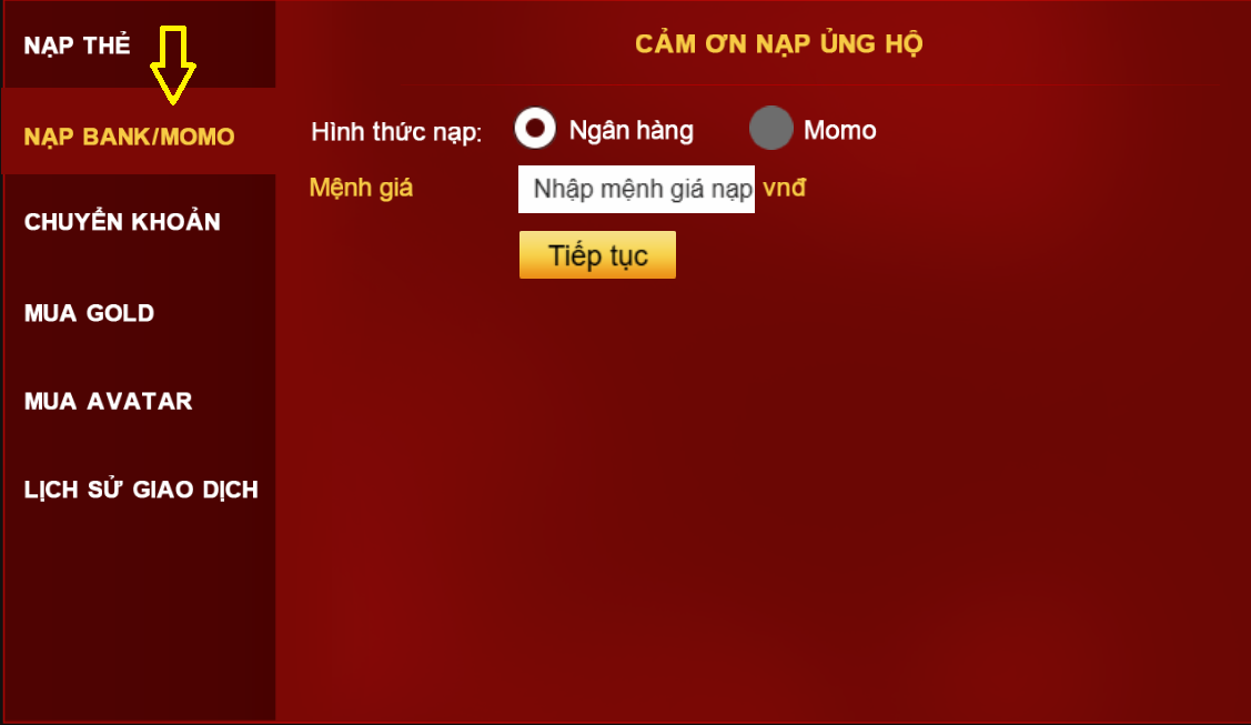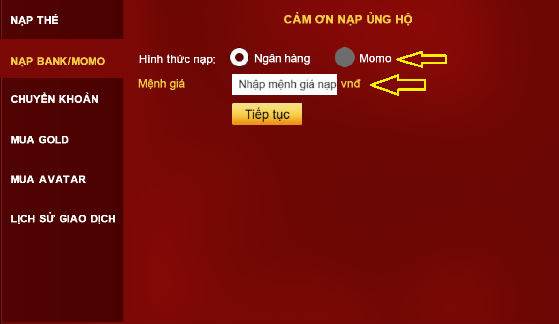 Bước 3: chọn hình thức nạp BANK hoặc MOMO, sau đó nhập mệnh giá và nhấn "Tiếp tục"