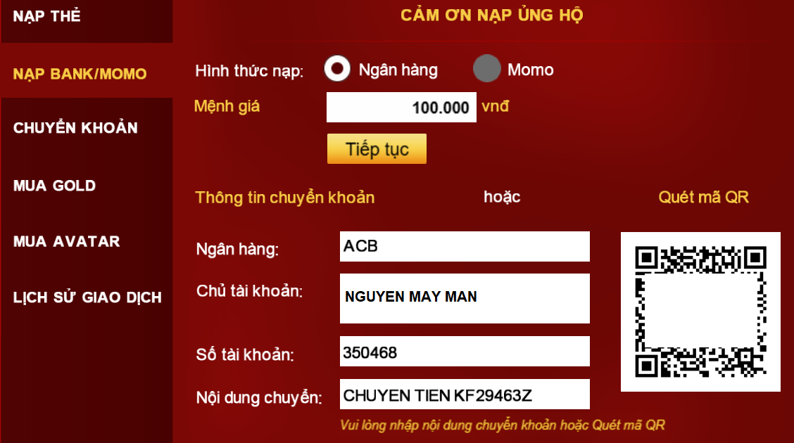 Bước 5: các bạn có thể nhập thông tin để chuyển khoản hoặc quét mã QR để hoàn tất. Sau ít giây các bạn sẽ nhận được số Chip tương ứng với mệnh giá đã nạp